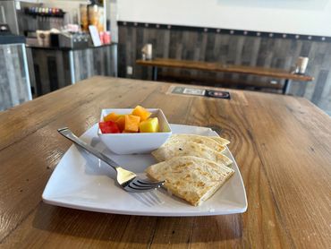 3 Quesadillas with carnitas, sour cream, fresh cheese, tomatoes, cilantro, rice and beans.